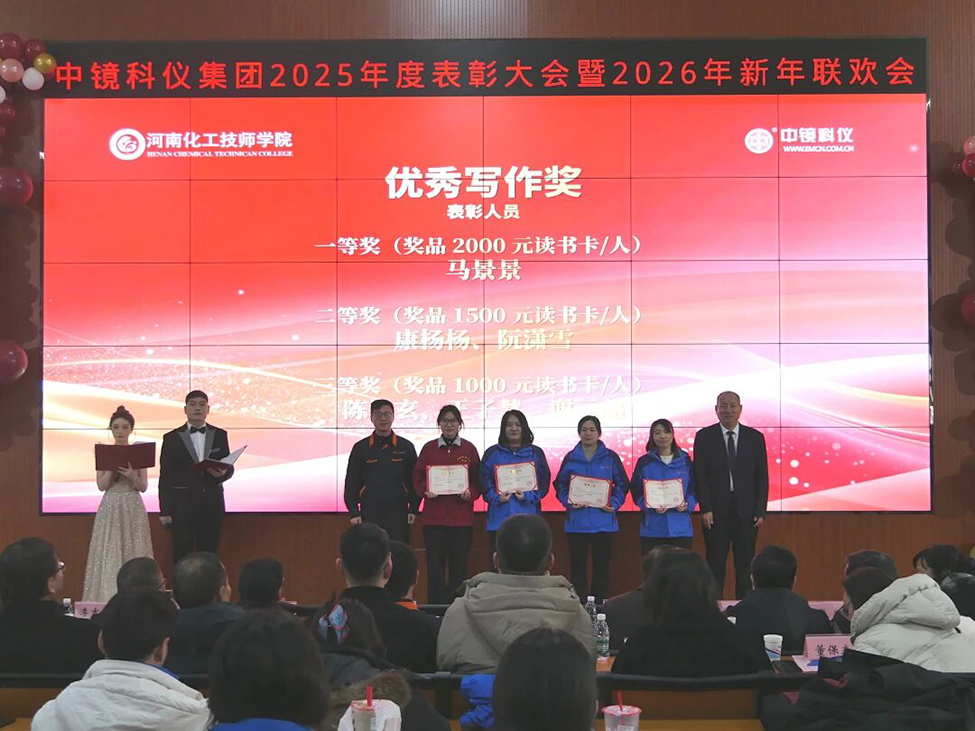 【廿載同行 共鑄輝煌】 中鏡科儀集團2025年度表彰大會暨 2026年新年聯歡會成功舉行! 2025年12月27日下午,以“廿載同行 共鑄輝煌”為主題的中鏡科儀集團2025年度表彰大會暨2026年新年聯歡會,在河南化工技師學院現代化工實訓大樓617報告廳隆重舉行。大會設立開封主會場及北京、南京、廣州、沈陽、西安、北美六大分會場,中鏡科儀集團全體員工、河南化工技師學院檢驗檢測產業學院全體師生及相關單位代表齊聚一堂,共慶廿載榮光,啟航新程。 會議現場 大會在莊嚴而熱烈的氛圍中拉開序幕。多位行業頂尖專家學者與中鏡科儀集團及合作院校的領導共同出席本次盛會。出席會議的專家領導有:第三屆電子顯微鏡技術專業教育教學指導委員會專家教授——楊勇驥(海軍軍醫大學)、洪健(浙江大學)、李炎(河南科技大學)、陳明霞(西安交通大學)、崔麗(吉林大學)、范光(核工業北京地質研究院)、李吉學(浙江大學);特邀專家——河北醫科大學原電鏡實驗中心主任、中國電鏡學會生物醫學專業委員會主任委員、首屆電鏡技術專家咨詢委副主任委員馬洪駿教授,西安交通大學王鵬教授,上海大學工程師寇春合;合作院校領導及中鏡科儀集團——河南化工技師學院黨委委員、副校長趙峰,河南化工技師學院檢驗檢測產業學院副院長李曉英、火隆、王振峰,微束科技集團、中鏡科儀集團董事長、河南電鏡學會副理事長、第三屆電鏡專業教指委委員兼秘書長、首屆電鏡技術專家咨詢委委員兼秘書長郭新勇,微束科技集團副總經理、中鏡科儀集團總經理任江鳴,微束科技集團副總經理、中科百測集團總經理許耀華,中鏡科儀集團副總經理王萍,中鏡科儀科技副總、河南大學教授張普濤,菲泰姆品牌總經理董保杰等。中鏡科儀各地區負責人及全體員工和電鏡專業應往屆畢業生在線參會。大會由中鏡科儀集團市場中心孔德勝、李夢娜與電鏡專業25級學生劉天送、侯錦譽共同主持。 校企聯合主持節目 大會伊始,河南化工技師學院黨委委員、副校長趙峰致辭,他在致辭中回顧校企共建電鏡專業成果,強調產教融合多方共贏,提出未來深化合作、擴大國際交流及強化社會服務三大展望,通過校企合作使電鏡專業再創輝煌。 趙峰致辭 大會期間,第四屆電鏡操作維護培訓班結業儀式在年會中舉行。該培訓班以夯實電鏡人才實操能力、助力行業技術水平提升為核心目標。海軍軍醫大學教授楊勇驥致辭,祝賀學員結業并勉勵大家理論結合實踐、創新提能。廣州國家實驗室陳偉棟作為學員代表致謝,表示將學以致用,為電鏡領域發展貢獻力量。隨后,趙峰、郭新勇、寇春合共同為學員頒發結業證書。 楊勇驥致辭 陳偉棟作為學員代表發言 頒發結業證書合影 本次年會設置了多項表彰環節,其中特別設置了“科普達人頒獎”環節。開封市科學技術協會正式聘任中鏡科儀集團的郭新勇、張康、郭芳銘、趙勝藍、裴霞5人為2025年度“開封市科普達人”。這一聘任不僅是對中鏡科儀長期深耕電鏡科普領域、助力全民科學素質提升的高度認可與充分肯定,彰顯了企業在推動科學知識普及、營造良好科學氛圍方面的積極貢獻;更通過樹立科普榜樣,激勵更多人投身科普事業,激發社會各界對科學知識的關注與熱情,為提升全民科學素養注入強大動力。現場,楊勇驥教授為科普達人頒發榮譽聘書,趙勝藍、裴霞代表領獎,贏得全場熱烈掌聲。 科普達人合影 2025年,中鏡科儀集團與河南化工技師學院檢驗檢測產業學院深化產教融合成果顯著,在年度表彰中特別聚焦電鏡專業學生成長——對優秀學子予以隆重表彰,既展現了校企協同育人模式下高素質技術技能人才的培育成效,也為職業教育服務科研創新提供了生動范本。同期,中鏡科儀集團對內部員工進行表彰,涵蓋個人貢獻、管理創新及跨部門協作典范等領域,通過樹立標桿強化“奮斗者文化”,既肯定了員工在挑戰中砥礪奮進的個體價值,也凝聚了企業以人才驅動高質量發展、共鑄行業輝煌的戰略共識。 電鏡專業頒獎現場圖集: 中鏡科儀集團頒獎現場圖集: 員工與師生攜手打造的聯歡會將年會氛圍推向沸點,整場演出以"技術賦能藝術,創新融合情懷"為脈絡,呈現了一場視聽與思想的雙重盛宴。舞蹈《讓我們一起出發》以剛勁有力的動作勾勒出勇攀高峰的奮進姿態;樂器聯奏《小寶貝—非洲鼓》、《茍活—架子鼓》、《中學時代—吉他彈唱》跨風格碰撞,展現團隊多元活力;由電鏡專業師生自編自導的情景劇《鈉試樣的"信號派對"》,將元素分析過程轉化為趣味科普劇場,引發現場科研工作者的共鳴掌聲;詩朗誦《微觀筑夢,黨旗領航》以鏗鏘聲線傳遞黨建引領企業高質量發展的初心使命;實習學生代表登臺演講《實踐淬志,汗映青春》,以輕快節奏講述實習期間成長故事,生動詮釋"匠心傳承"的實踐真諦;快板說唱《科技賦能新時代》快板說唱交織間以科技金句點燃全場;創意歌舞《聚力陣線聯盟》則通過舞蹈與歌聲的融合,生動詮釋跨領域協作的無限可能;線上節目《好運來》、《上春山》則通過線上互動打破空間界限,將祝福送至現場。節目間隙的幸運觀眾抽獎環節,讓線上線下參會者倍感集體溫暖,歡樂氛圍持續升溫。 節目現場圖集: 年會最后,由任江鳴做新年致辭,他在致辭中特別強調了本次年會的主題“廿載同行 共鑄輝煌”的深刻內涵,并指出2025年