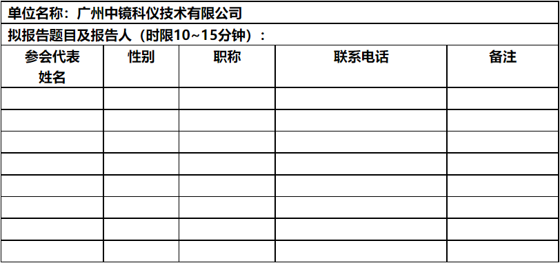 關(guān)于2012年度學(xué)會(huì)年會(huì)的通知(第一輪) 各會(huì)員單位: 廣東省電鏡學(xué)會(huì)理事會(huì)定于2012年12月22~24日在河源舉辦2012年度學(xué)術(shù)年會(huì)。本次會(huì)議的主要議題包括:學(xué)會(huì)年度總結(jié)、專題學(xué)術(shù)報(bào)告和新型儀器設(shè)備技術(shù)介紹。 歡迎會(huì)員單位電鏡同行以及剛剛加入我們學(xué)會(huì)的共聚焦的專家學(xué)者踴躍報(bào)名參加,介紹近期各自的研究工作,增強(qiáng)會(huì)議學(xué)術(shù)氣氛,豐富會(huì)議內(nèi)容,敬請(qǐng)于11月30日前填妥回執(zhí)表,將參加人員數(shù)和報(bào)告題目告知學(xué)會(huì)秘書。以便會(huì)議安排及發(fā)第二輪正式通知。(電話/Email 告知均可) 具體事宜如下: (1)參會(huì)代表在指定地點(diǎn)集中登車,前往會(huì)議地點(diǎn)。 (2)會(huì)議地點(diǎn):河源天上人間溫泉酒店 (3)會(huì)務(wù)費(fèi):800元/人(包含交通、食宿費(fèi)及參觀費(fèi)用) 會(huì)議期間,請(qǐng)各單位交納2012年度會(huì)費(fèi),理事長(zhǎng)、副理事長(zhǎng)單位200元,理事單位150元,一般會(huì)員單位100元。 聯(lián)系人:路艷蒙(學(xué)會(huì)秘書) 通訊地址:510515,廣州市同和南方醫(yī)科大學(xué)分析測(cè)試中心 電話:020-61648174(辦) 13660510858(手機(jī)) E-mail:luyanmeng@hotmail.com, yanmenglu@yahoo.com.cn 廣東省分析測(cè)試協(xié)會(huì)電子顯微鏡專業(yè)委員會(huì) 2012-11-20 廣東省電鏡學(xué)會(huì) 關(guān)于2012年度學(xué)會(huì)年會(huì) 參會(huì)回執(zhí) 注:請(qǐng)各會(huì)員單位確保上報(bào)名單中參會(huì)代表的到會(huì),避免臨時(shí)缺席帶來不必要的損失。(若攜帶家屬,請(qǐng)將家屬姓名也填入表格,并在備注中說明)