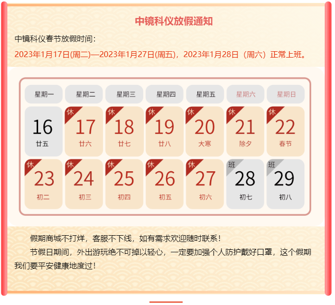 玉免迎春至,黃鶯報喜來。值此新春佳節(jié)來臨之際,中鏡科儀攜全體員工謹(jǐn)向長期以來關(guān)心、支持、信賴我們的各級領(lǐng)導(dǎo)、老師、社會各界朋友、廣大客戶以及合作伙伴,致以衷心的感謝和美好的祝愿! 逐漸遠(yuǎn)去的2022年,我們歷經(jīng)困難與挑戰(zhàn),我們收獲成長與喜悅。加速奔來的2023年,中鏡科儀全體同仁將繼續(xù)振作精神、踔厲奮發(fā)、勇毅前行,全方位推動公司高質(zhì)量發(fā)展行穩(wěn)致遠(yuǎn),再創(chuàng)中鏡科儀新輝煌! 最后,祝大家在新的一年里闔家幸福、身體健康、萬事如意、新年快樂!