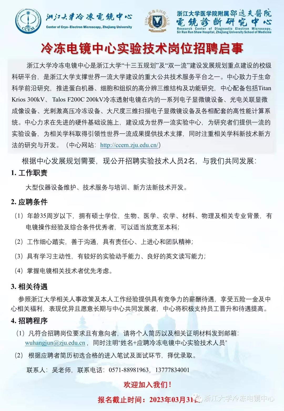 【行業招聘】浙江大學冷凍電鏡中心實驗技術崗位招聘啦!