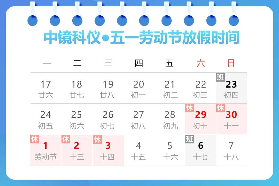 心有所向,勞有所獲。在萬物更新的春日,我們迎來了全世界勞動者最盛大的節日——五一國際勞動節!勞動是世界上一切歡樂和一切美好事情的源泉。勞動創造人類,勞動創造世界,勞動更創造未來。在此,中鏡科儀向所有平凡而偉大的勞動者——致敬! 放假通知 中鏡科儀五一勞動節放假時間: 2023年4月29日(星期六)至2023年5月3日(星期三)放假,共5天; 2023年4月22日(星期六)調休; 2023年4月23日(星期日)、2023年5月6日(星期六)正常上班。 假期商城不打烊,客服不下線,如有需求歡迎隨時聯系!感謝大家一直以來對中鏡科儀的支持與信任! 春夏季氣候多變,大家外出一定要注意防護,佩戴好口罩,勤洗手消毒,注意出行安全,度過一個快樂、平安的節日假期。 聯系我們 公司官網:m.jzbj.com.cn 免費熱線/企業QQ:400 001 9621 市場部郵箱:zjky@emcn.com.cn 官方商城 :http://www.emcn.net.cn/ 地區負責人聯系方式 北京地區:張經理 18642002287 南京地區:鄭經理 15050567596 廣州地區:鄭經理 13724052586 西安地區:馬經理 13324587366 沈陽地區:王經理 15140221479 鄭州地區:唐經理 15237816868