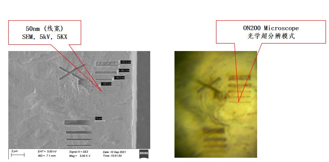 50nm 線寬的特征線, 由SEM確認尺度,以ON200超分辨模式(ON200物鏡系統(tǒng))可以清晰完整觀察該特征線的連續(xù)像。