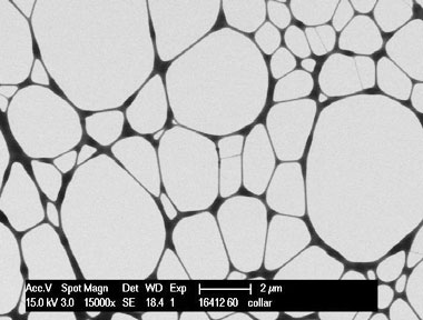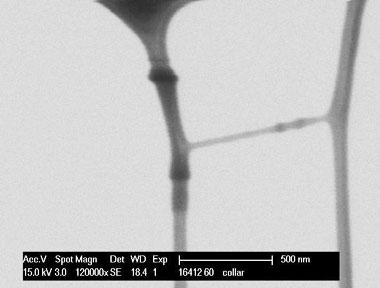 STEM載網(wǎng)樣品臺(tái) (STEM Imaging Holder) 在掃描電鏡上配置透射附件,應(yīng)用透射模式(Scanning transmission electron microscopy,STEM)可得到物質(zhì)的內(nèi)部結(jié)構(gòu)信息,使其既有掃描電鏡的功能,又具備透射電鏡的功能,與透射電鏡相比,由于其加速電壓低,所以可顯著減少電子束對(duì)樣品的損傷,而且可大大提高圖像的襯度,特別適合于有機(jī)高分子、生物等軟材料樣品的透射分析。 該STEM載網(wǎng)樣品臺(tái)可以裝載一枚TEM標(biāo)準(zhǔn)載網(wǎng),STEM像由一塊可調(diào)的鉑轉(zhuǎn)換板生成,轉(zhuǎn)換板要面向SE探測器,使用樣品室現(xiàn)有的SE探測器是一個(gè)比較經(jīng)濟(jì)有效的STEM成像方法。該樣品臺(tái)還配有一個(gè)防散射套筒(導(dǎo)電塑料),放置在樣品臺(tái)和極靴之間,可以有效阻止探測器接收樣品表面的二次電子信號(hào),從而得到更加清晰的STEM圖片。 微柵支持膜的STEM圖像 樣品臺(tái)結(jié)構(gòu)示意 樣品臺(tái)支架 可傾轉(zhuǎn)鋁臺(tái) 鉑轉(zhuǎn)換板 帶小孔TEM載網(wǎng)載臺(tái) 防散射套筒(導(dǎo)電塑料) 樣品臺(tái)釘型腿(3.2 x 9.5mm) 六角扳手 樣品安裝方法 1.六角扳手?jǐn)Q松螺絲,取下防散射套筒; 2. 松開帶小孔TEM載網(wǎng)載臺(tái)螺絲并取下; 3. 將載網(wǎng)載臺(tái)頂部朝下水平放置在桌面; 4. 松開載臺(tái)頂部的固定螺絲,并小心提起載臺(tái)底部; 5. 將TEM載網(wǎng)平放在載臺(tái)頂部的凹槽中,有樣品的一面朝下;確保載網(wǎng)水平完整地被放置在載網(wǎng)載臺(tái)頂部的凹槽中; 6.將載網(wǎng)載臺(tái)的底部重新對(duì)接到頂部上,并上緊螺絲; 7.將載網(wǎng)載臺(tái)重新安放在樣品臺(tái)支架上,并上緊螺絲; 8.將防散射套筒安放在載網(wǎng)載臺(tái)上,并上緊螺絲; 樣品臺(tái)尺寸 整體高度:37.5mm 不加套筒高度:29.2mm 掃描電鏡STEM模式的應(yīng)用 透射電鏡的加速電壓較高(一般為120-200kV),對(duì)于有機(jī)高分子、生物等軟材料樣品的穿透能力強(qiáng),形成的透射像襯度低,而掃描電鏡的加速電壓較低(一般用10-30kV),因此應(yīng)用其STEM模式成透射像,可大大提高像的襯度。圖3所示為有機(jī)太陽能電池用的高分子/富勒烯薄膜(有機(jī)固體實(shí)驗(yàn)室樣品)的透射電子像,在用透射電鏡觀察其分相結(jié)構(gòu)時(shí),由于兩部分襯度都低,因此幾乎無法區(qū)分,而應(yīng)用掃描電鏡的STEM模式觀察時(shí),可清楚地觀察到兩相的結(jié)構(gòu)。 應(yīng)用透射電鏡觀察生物樣品時(shí),由于樣品的襯度很低,須經(jīng)過鈾、鉛等重金 屬染色才能獲得其結(jié)構(gòu)信息,然而染色不僅麻煩而且可能會(huì)改變樣品的結(jié)構(gòu)。在 應(yīng)用掃描電鏡的STEM模式觀察生物樣品時(shí),樣品無需染色直接觀察即可獲得較 高襯度的圖像,圖4為應(yīng)用STEM模式觀察得到的未染色的生物品的電鏡圖,可 以看到其納米尺度的片層結(jié)構(gòu)。 除了可顯著提高透射像的襯度外,應(yīng)用掃描電鏡STEM成像還有一個(gè)優(yōu)勢是可對(duì)樣品同時(shí)成掃描二次電子像和透射像,既可以得到同一位置的表面形貌信息又可以得到內(nèi)部結(jié)構(gòu)信息,避免了在掃描電鏡和透射電鏡之間轉(zhuǎn)換樣品、定位樣品的麻煩。圖5所示為應(yīng)用掃描電鏡觀察有機(jī)螺旋納米線(光化學(xué)實(shí)驗(yàn)室樣品)得到的二次電子像和透射像(STEM明場像和暗場像),從二次電子像可以清楚地觀察到納米線的螺旋結(jié)構(gòu),從透射像可以看出納米線是實(shí)心結(jié)構(gòu)非空心管結(jié)構(gòu)。 總之,隨著科學(xué)研究的深入對(duì)于物質(zhì)結(jié)構(gòu)分析的要求越來越高,掃描電鏡STEM透射模式由于其襯度高、損傷小等特點(diǎn),非常適合于有機(jī)高分子、生物等軟材料的結(jié)構(gòu)分析,將在此類材料的分析表征中發(fā)揮不可替代的作用。 案例應(yīng)用摘自中國科學(xué)院化學(xué)所分析測試中心
