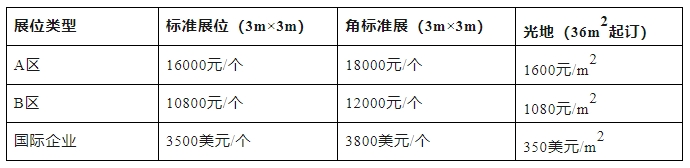 注:A.標(biāo)準(zhǔn)展位配備:中英文楣板(寬度25cm)、日光燈兩盞、隔板(高度250cm,可用高度246cm)、洽談桌一張、椅子兩把、可容400W/220V電源插座一個(gè)及地毯;