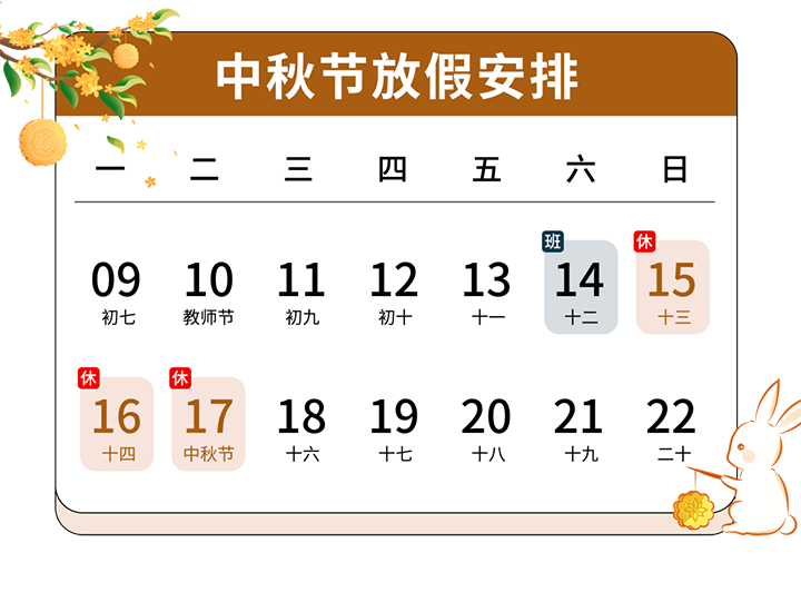 2024年9月15日(星期日)至2024年9月17日(星期二)放假,共3天。